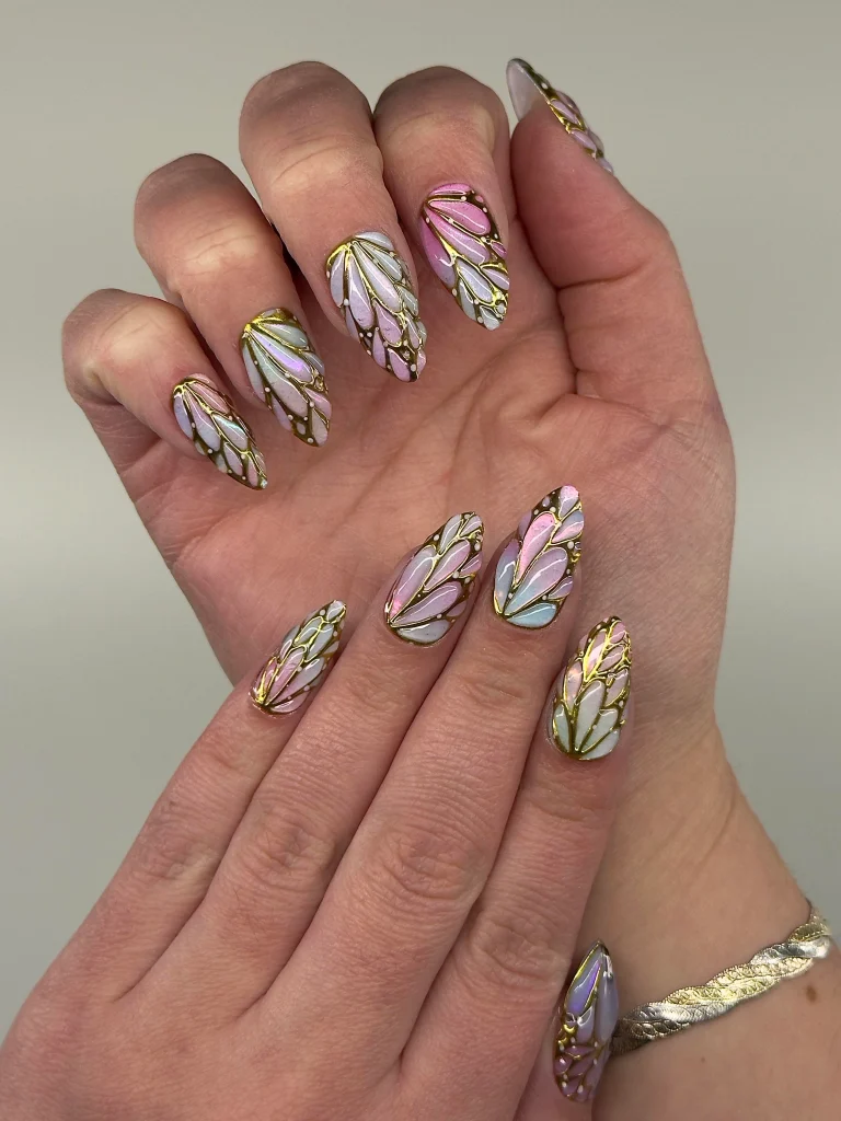 Soft pastel shades of pink, lavender, blue, and white blend together in a stained-glass butterfly wing effect, outlined with fine gold detailing. This luxurious design feels artistic and elegant, perfect for anyone who loves colorful nail art with a touch of sophistication.