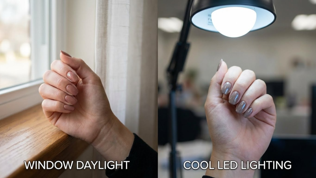 Indoor lights vary: warm bulbs (2700–3000K) boost red and orange in mocha, while cool LEDs (5000–6500K) pull out ashy or taupe notes. I test nails near a window and then under home lighting to see the difference. For accurate color matching, I use a daylight lamp like those used by nail techs; the FDA and lighting guides note how color temperature affects appearance (example source: U.S. Department of Energy).