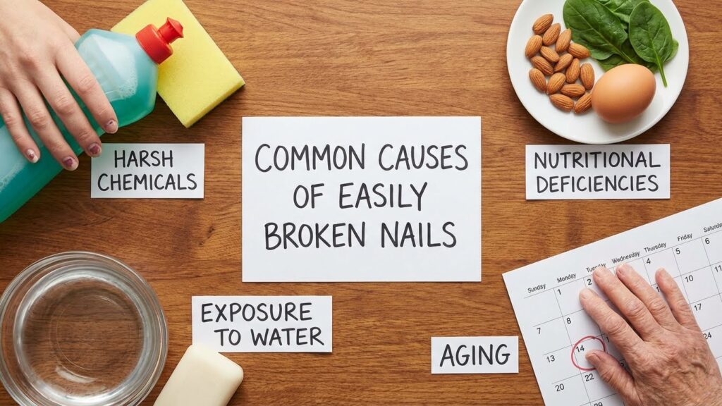 Nails break easily for many reasons. These include dryness, frequent exposure to water or chemicals, low levels of key nutrients like protein and iron, and health issues such as thyroid imbalances. Some habits, such as nail biting, also weaken nails and increase the chance of breakage.