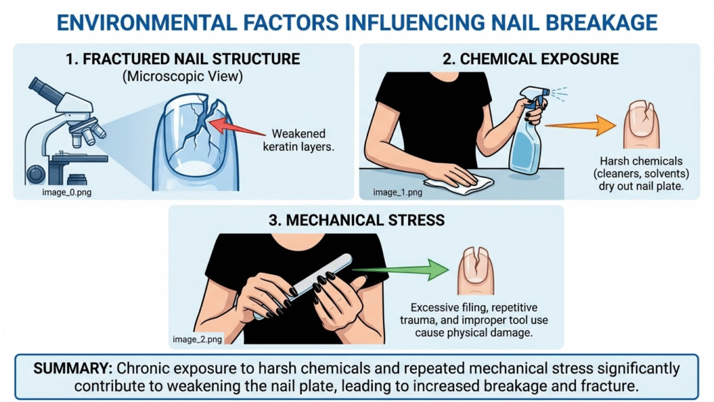 Work environments involving detergents or solvents increase chemical exposure to nails. These substances can make nails thin and fragile if protection is not used.